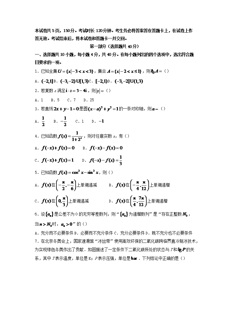 2022年北京高考数学试题及答案本试卷共5页,150分。考试时长120分钟。考生务必将答案答在答题卡上,在试卷上作答无效。考试结束后,将本试卷和答题卡一并交回。第一部分(选择题共40分)一、选择...2022-11-17