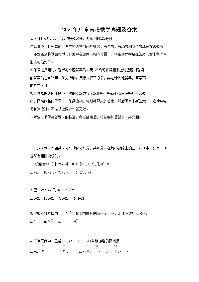 2021年广东高考数学真题及答案
