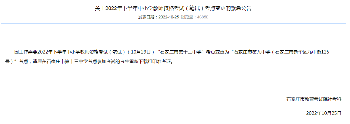 关于2022年下半年河北石家庄中小学教师资格考试(笔试)考点变更的紧急公告