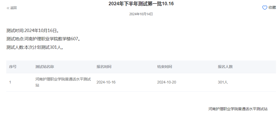 河南护理职业学院2024年普通话报名时间:2024年10月20日