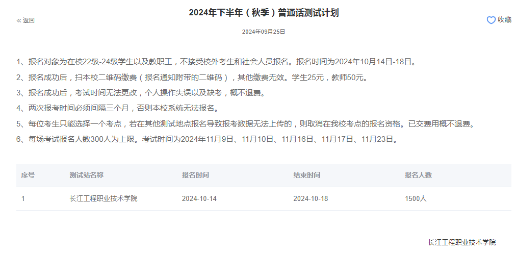 长江工程职业技术学院2024年普通话报名时间:2024年10月14日