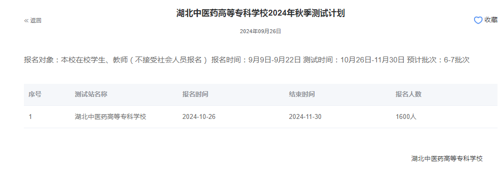湖北中医药高等专科学校2024年普通话报名时间:2024年10月26日
