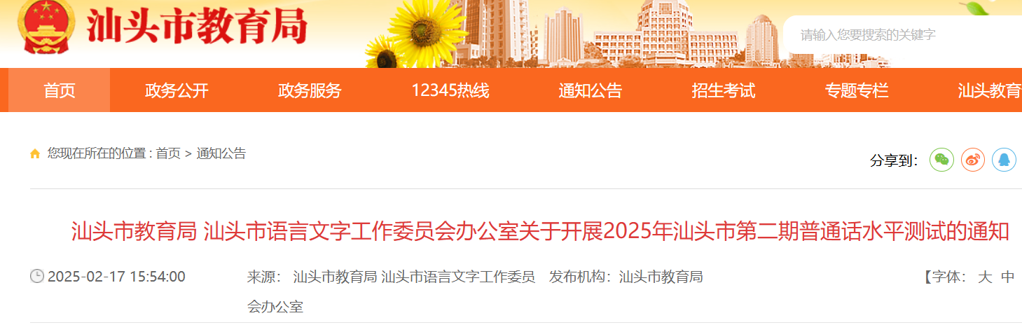 汕头市教育局:2024年广东汕头市第一期普通话水平测试的通知
