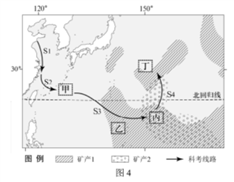 中国某科考船赴西北太平洋进行深海科学与资源考察。已知两种海底矿产的分布,如圈4所示。读图,回答第6、7题。