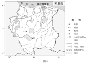 苏里南人口约60万,人口构成中有来自中国广东省等地的华裔,中国农历新年是全国性节日之一。该国人均国内生产总值约为7千美元(2020年),工业以铝土矿开采和加工为主,原始森林覆盖率超过90%,2014年已实现二氧化碳零排放。读图8,回答第14、15题。