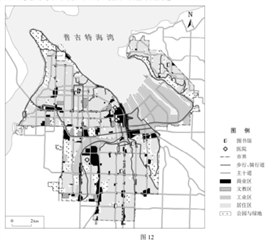 美国塔科马市(47°17'N,122°28'W)是位于北太平洋东岸的港口城市,人口约21.9万(2020年)。该市一位名叫约克的年轻人非常喜爱中国文化,工作之余经常前往图书馆读书,或漫步公园游憩。1873年,横贯美洲大陆的北太平洋铁路建成。这条铁路成了分处铁路两端的约克曾祖父母缔结姻缘的纽带。他们初识时,位于铁路西端的塔科马仅千余人,到1889年人口达3.6万。图12示意塔科马市内部空间结构。读图,回答下列问题。