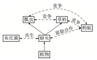 蚜虫是陆地生态系统中常见的昆虫。春季蚜虫从受精卵开始发育,迁飞到取食宿主上度过夏季,其间行孤雌生殖,经卵胎生产生大量幼蚜;秋季蚜虫迁飞回产卵宿主,行有性生殖,以受精卵越冬。蚜虫周围生活着很多生物,体内还有布氏菌等多种微生物,这些生物之间的关系如图。