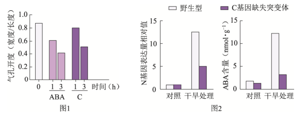 (2)分别用微量(0.1μmol·L-1)的C或ABA处理拟南芥根部后,检测叶片气孔开度,结果如图1。