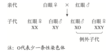 4.控制果蝇红眼和白眼的基因位于X染色体。白眼雌蝇与红眼雄蝇杂交,子代中雌蝇为红眼,雄蝇为白眼,但偶尔出现极少数例外子代。子代的性染色体组成如图。