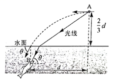 d。训练员将小球向左水平抛出,入水点在B位置的正上方,入水前瞬间速度方向与水面夹角为θ。小球在A位置发出的一束光线经水面折射后到达B位置,折射光线与水平方向的夹角也为θ。