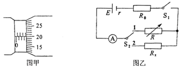 (2)该小组用如图乙所示的电路测量该圆柱形电阻Rx的阻值。图中电流表量程为0.6A、内阻为1.0Ω,定值电阻R0的阻值为20.0Ω,电阻箱R的最大阻值为999.9 Ω。首先将S2置于位置1,闭合S1,多次改变电阻箱R的阻值,记下电流表的对应读数I,实验数据见下表。