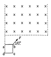 如图所示,高度足够的匀强磁场区域下边界水平、左右边界竖直,磁场方向垂直于纸面向里。正方形单匝线框abcd的边长L=0.2 m、回路电阻R=1.6×10-3Ω、质量m=0.2 kg。线框平面与磁场方向垂直,线框的ad边与磁场左边界平齐,ab边与磁场下边界的距离也为L。现对线框施加与水平向右方向成θ=45°角、大小为