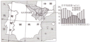 埃布罗河是西班牙第一大河,流域内修建了多座大坝,用以调节流量的季节分配。图7为“埃布罗河流域位置及其某支流上水文站月平均流量变化图”。据此回答19~20题。