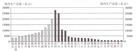 材料二2020年,广东和江苏国内生产总值(GDP)居全国第一、第二位。图11为“2020年江苏和广东各地级市GDP统计图”。
