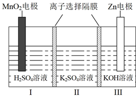 ,Ⅰ区MnO2为电池的正极,电极反应为MnO2+2e-+4H+=Mn2++2H2O;电池在工作过程中,由于两个离子选择隔膜没有指明的阳离子隔膜还是阴离子隔膜,故两个离子隔膜均可以通过阴、阳离子,因此可以得到Ⅰ区消耗H+,生成Mn2+,Ⅱ区的K+向Ⅰ区移动或Ⅰ区的SO