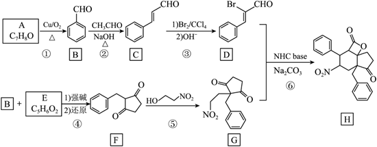 C、N、O、F四种元素在同一周期,同一周期第一电离能的总体趋势是依次升高的,但由于N元素的2p能级为半充满状态,因此N元素的第一电离能较C、O两种元素高,因此C、N、O、F四种元素的第一电离能从小到大的顺序为C 【小问3详解】 固体HF中存在氢键,则(HF)3的链状结构为 【小问4详解】 CF2=CF2中C原子存在3对共用电子对,其C原子的杂化方式为sp2杂化,但其共聚物ETFE中C原子存在4对共用电子对,其C原子为sp3杂化;由于F元素的电负性较大,因此在于C原子的结合过程中形成的C-F键的键能大于聚乙烯中C-H的键能,键能的强弱决定物质的化学性质,键能越大,化学性质越稳定,因此聚四氟乙烯的化学稳定性高于聚乙烯,故答案为:sp2、sp3、C-F键的键能大于聚乙烯中C-H的键能,键能越大,化学性质越稳定。 【小问5详解】 根据萤石晶胞结构,浅色X离子分布在晶胞的顶点和面心上,则1个晶胞中浅色X离子共有8× 【化学—选修5,有机化学基础】 12. 用N-杂环卡其碱(NHC base)作为催化剂,可合成多环化合物。下面是一种多环化合物H的合成路线(无需考虑部分中间体的立体化学)。 回答下列问题: (1)A的化学名称为_______。 (2)反应②涉及两步反应,已知第一步反应类型为加成反应,第二步的反应类型为_______。 (3)写出C与 (4)E的结构简式为_______。 (5)H中含氧官能团的名称是_______。 (6)化合物X是C的同分异构体,可发生银镜反应,与酸性高锰酸钾反应后可以得到对苯二甲酸,写出X的结构简式_______。 (7)如果要合成H的类似物H′( 【答案】(1)苯甲醇 (2)消去反应 (3) (6) 【解析】 【分析】由合成路线,A的分子式为C7H8O,在Cu作催化剂的条件下发生催化氧化生成B,B的结构简式为 【小问1详解】 由分析可知,A的结构简式为 【小问2详解】 由B、C的结构简式,结合反应条件,可知B( 【小问3详解】 根据分析可知,C与Br2/CCl4发生加成反应得到 【小问4详解】 由分析,E的结构简式为 【小问5详解】 H的结构简式为 【小问6详解】 C的结构简式为 【小问7详解】 G与D反应生成H的反应中,D中碳碳双键断裂与G中HC—NO2和C=O成环,且C=O与—CHO成环,从而得到H,可推知,若要合成H′(