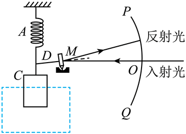 12. 光点式检流计是一种可以测量微小电流的仪器,其简化的工作原理示意图如图所示。图中A为轻质绝缘弹簧,C为位于纸面上的线圈,虚线框内有与纸面垂直的匀强磁场;随为置于平台上的轻质小平面反射镜,轻质刚性细杆D的一端与M固连且与镜面垂直,另一端与弹簧下端相连,PQ为圆弧形的、带有均匀刻度的透明读数条,PQ的圆心位于M的中心使用前需调零,使线圈内没有电流通过时,M竖直且与纸面垂直;入射细光束沿水平方向经PQ上的O点射到M上后沿原路反射。线圈通入电流后弹簧长度改变,使M发生倾斜,入射光束在M上的入射点仍近似处于PQ的圆心,通过读取反射光射到PQ上的位置,可以测得电流的大小。已知弹簧的劲度系数为k,磁场磁感应强度大小为B,线圈C的匝数为N。沿水平方向的长度为l,细杆D的长度为d,圆弧PQ的半径为r﹐r >> d,d远大于弹簧长度改变量的绝对值。