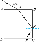 16. 如图,边长为a的正方形ABCD为一棱镜的横截面,M为AB边的中点。在截面所在平的,一光线自M点射入棱镜,入射角为60°,经折射后在BC边的N点恰好发生全反射,反射光线从CD边的P点射出棱镜,求棱镜的折射率以及P、C两点之间的距离。