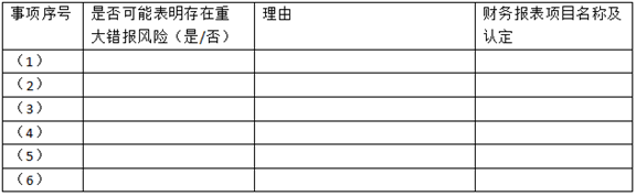 针对资料第(1)至(6)项,结合资料二,假定不考虑其他条件,逐项指出资料一所列事项是否可能表明存在重大错报风险。如果认为可能表明存在重大错报风险,简要说明理由,如果认为该风险为认定层次重大错报风险,说明该风险主要与哪些财务报表项目的哪些认定相关(不考虑税务影响)。