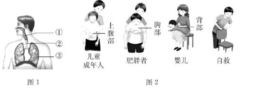 由图2可知,对儿童和成年人进行急救时,应快速向后上方挤压其上腹部。挤压时,被施救者的膈顶上升,使胸腔容积缩小,使肺内的气压增大,肺内气体就会推动异物向外移动(相当于向外呼气的过程),故选a。
