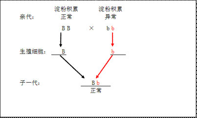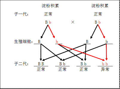 由遗传图解可知,子一代都是淀粉积累正常,自交后,子二代出现了淀粉积累异常植株,因此淀粉积累异常是是隐性性状,并且子一代是性状是显性性状,基因组成是杂合体,若用B、b表示控制该性状的基因,子一代的基因组成是Bb。