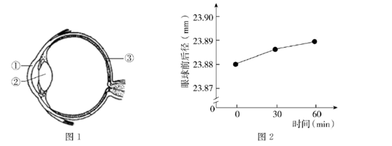 (3)科研人员请视力正常的成年志愿者在弱光照下阅读,测定阅读前(0min)、阅读30min和60in时眼球前后径,结果如图2。与阅读前相比较,志愿者弱光照阅读后的眼球前后径变_____,推测长期弱光照阅读可能是引起_____(填“近视”或“远视”)的原因之一。
