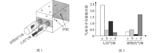 (3)科研人员测定出人和动物的气味均含有多种成分,其中主要气味分子a、b、c和d的含量如图2所示。据图推测,人的气味中吸引伊蚊的是a和_______两种气味分子,依据是________________________。