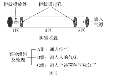 ③多次重复实验发现,A组伊蚊飞一会儿就随机停在1、2或3的某个区;B组伊蚊都兴奋地飞到3区;C组伊蚊的表现与B组相同。根据实验结果,可得出的结论是_______________________________________________________。