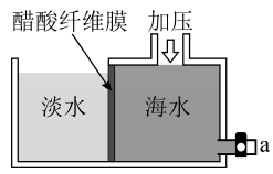 14. 我省是海洋大省,海水淡化一直是重要研究课题,膜技术的引入使研究有了突破性进展。如图对醋酸纤维膜右侧的海水加压,水分子可透过膜进入左侧淡水池,而海水中各种离子不能通过膜,从而得到淡水。下列有关说法正确的是