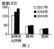 2017~2019年世界主要地区工业机器人使用数量统计图。读图,完成4~6题。