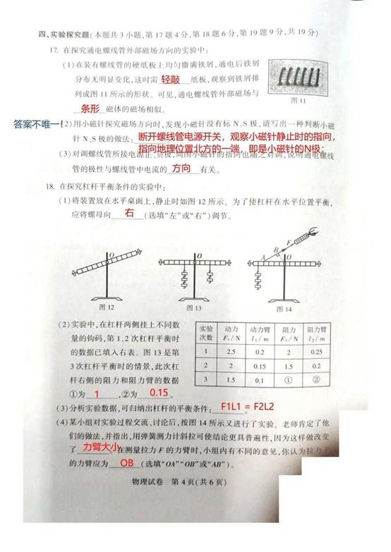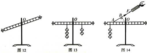 (4)某小组对实验过程交流、讨论后,按图14所示又进行了实验。老师肯定了他们的做法,并指出,用弹簧测力计斜拉可使结论更具普遍性,因为这样做改变了 。在测量拉力F的力臂时,小组内有不同的意见,你认为拉力的力臂应为 (选填“OA”“OB”或“AB”)。
