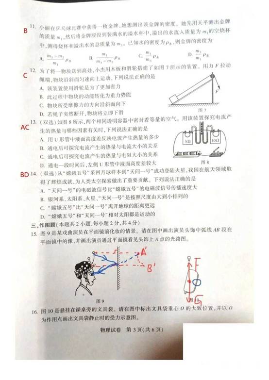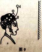 15.图9是某戏曲演员在平面镜前化妆的情景。请在图中画出演员头饰中弧线AB段在平面镜中的像,并画出演员通过平面镜看见头饰上A点的光路图。