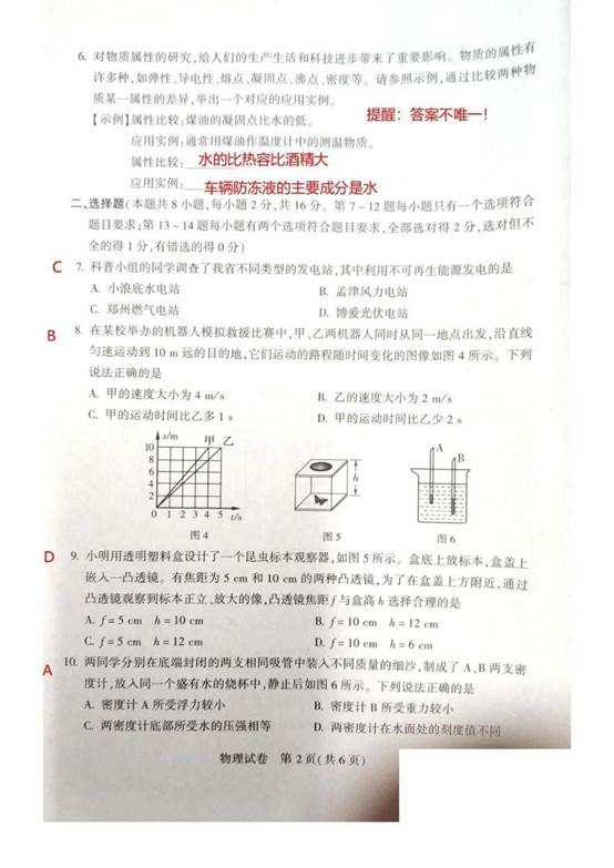 10.两同学分别在底端封闭的两支相同吸管中装入不同质量的细沙,制成了A、B两支密度计,放入同一个盛有水的烧杯中,静止后如图6所示。下列说法正确的是