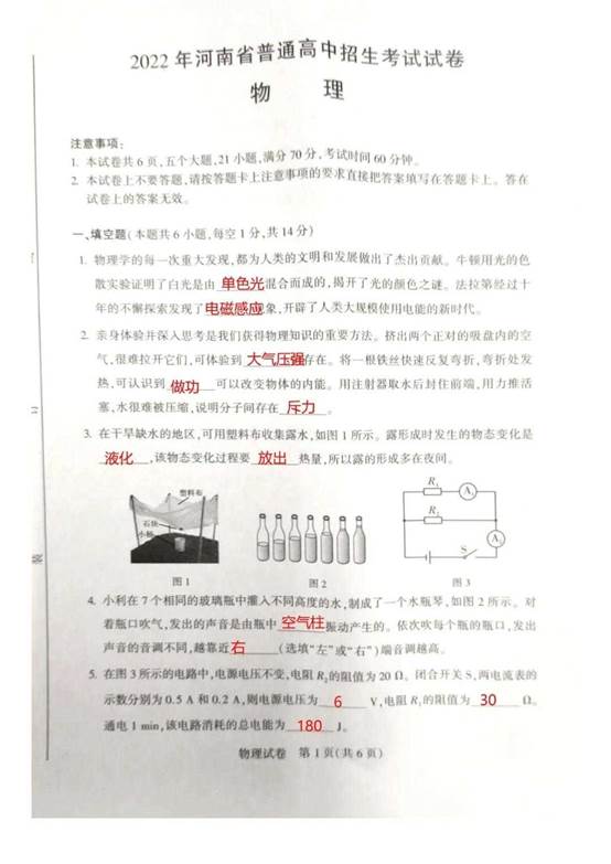 4.小利在7个相同的玻璃瓶中灌入不同高度的水,制成了一个水瓶琴,如图2所示。对着瓶口吹气,发出的声音是由瓶中振动产生的。依次吹每个瓶的瓶口,发出声音的音调不同,越靠近(选填“左”或“右”)端音调越高。