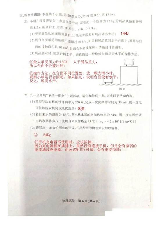 20.小明在科技博览会上参加义务劳动,需要把一个质量为12kg的展品从地面搬到高1.2m的展台上,如图18所示。g取10N/kg。