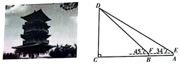 《清明上河图》建造的,拂云阁是园内最高的建筑.某数学小组测量拂云阁DC的高度,如图,在A处用测角仪测得拂云阁顶端D的仰角为34°,沿AC方向前进15m到达B处,又测得拂云阁顶端D的仰角为45°.已知测角仪的高度为1.5m,测量点A,B与拂云阁DC的底部C在同一水平线上,求拂云阁DC的高度(结果精确到1m.参考数据: