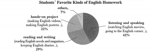 1.简要说明图表内容; 2.从图表中选出一种你最喜欢的作业类型,结合自己的经历,谈谈这种作业的好处。 要求: 1.词数不少于80词,首句已给出,不计入总词数; 2.文中不能出现真实的人名、校名; 3.参考词汇仅供参考。 |