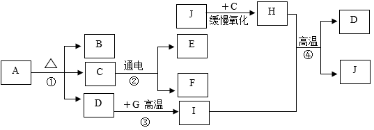 【分析】A~J是初中化学常见的物质,其中A为绿色粉末状固体B、J、G为黑色固体,H为铁锈的主要成分,铁锈是由铁同时接触空气中的氧气和水而发生的生锈,C在通电条件下生成E和F,D、I为组成元素相同的气体且D与G在高温条件下生成I,则A是碱式碳酸铜,B是氧化铜,C是水,D是二氧化碳,E是氧气,F是氢气,G是碳,H是氧化铁,I是一氧化碳,J是铁。代入验证,推理正确。