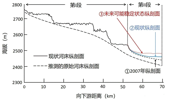 由图可知:在第II段河床,纵剖面①→②→③河床的海拔不断升高,河床不断变浅,说明从2007年到未来,河床泥沙淤积的速度大于河床被侵蚀的速度,导致河床堆积物变多,河床变浅,A正确;侵蚀大于淤积,会导致河床加深,B错误;侵蚀-淤积平衡河床的深度应该维持不变,C错误;持续不断侵蚀会导致河床加深,D错误。故选A。