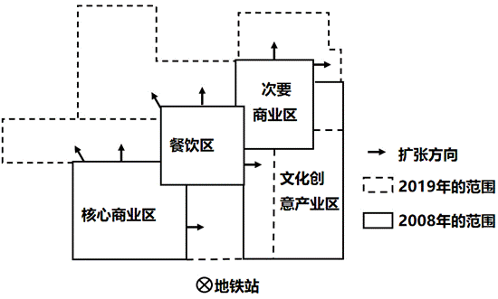 我国某特大城市一老旧厂区经过近十年的改造,于2006年被评为国家最佳文化创意产业园。2008年以来,该产业园又持续转型为文创旅游空间,大众游客替代文创从业者和爱好者成为消费的主要群体。下图示意2008--2019年该产业园功能分区演化。据此完成下面小题。