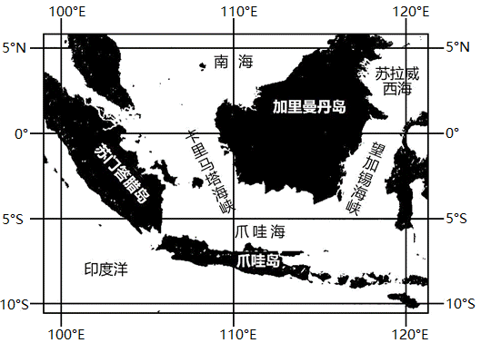 卡里马塔海峡是热带西太平洋和印度洋水体交换的通道。该海峡表层流流向季节变化明显:在北半球夏季,其流向向北;冬季,转向南流且流速达到最大值。下图示意卡里马塔海峡及周边区域自然地理环境。