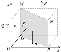 划分成两个区域,两区域分布有磁感应强度大小相等、方向相反且与z轴平行的匀强磁场。一质子以某一速度从立方体左侧垂直