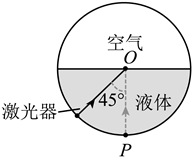 18. 一个水平放置的圆柱形罐体内装了一半的透明液体,液体上方是空气,其截面如图所示。一激光器从罐体底部P点沿着罐体的内壁向上移动,它所发出的光束始终指向圆心O点。当光束与竖直方向成
