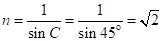 【解】当入射角达到45o时,恰好到达临界角C,根据