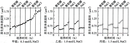 10. 原生质体(细胞除细胞壁以外的部分)表面积大小的变化可作为质壁分离实验的检测指标。用葡萄糖基本培养基和NaCl溶液交替处理某假单孢菌,其原生质体表面积的测定结果如图所示。下列叙述错误的是( )