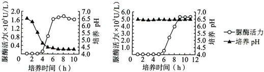 对比两坐标曲线,两图中脲酶活力随时间变化的曲线基本一致,说明培养时间不是决定因素;而维持pH在6.5不变与pH从6.5降为4.5相比较而言,酶活力值始终要高,说明pH为6.5时,有利于酶结构的稳定,故pH是决定工程菌L高脲酶活力的关键因素。