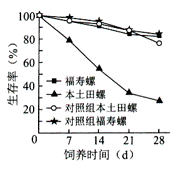 【分析】分析坐标图形:单独培养时,随培养时间增加,本地田螺生存率较高且持平,福寿螺生存率下降,混合培养时,本地田螺生存率下降,福寿螺生存率上升。