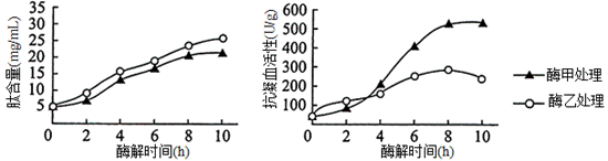 将提取的水蛭蛋白经甲、乙两种蛋白酶水解后,据图可知,水解产物中的肽含量随着酶解时间的延长均上升,且差别不大;而水解产物中抗凝血活性有差异,经酶甲处理后,随着酶解时间的延长,抗凝血活性先上升后相对稳定,经酶乙处理后,随着酶解时间的延长,抗凝血活性先上升后下降,且酶甲处理后的酶解产物的抗凝血活性最终高于经酶乙处理后的酶解产物的抗凝血活性,差异明显,据此推测两种处理后酶解产物的抗凝血活性差异主要与肽的种类有关,导致其活性不同的原因是提取的水蛭蛋白的酶解时间和酶的种类不同,导致水蛭蛋白空间结构有不同程度破坏。