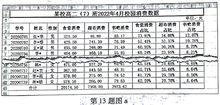 13.收集某校高二(7)班2022年4月校园消费数据,并使用Excel软件进行处理,如第13题图a所示。