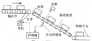 如图所示是纸箱输送系统的示意图。电机驱动输送带将纸箱送到输送辊道,纸箱自由下滑至装载平台。光电传感器检测光线是否被遮挡,当光线被遮挡时间超过设定值时,表明纸箱在输送辊道上拥堵,控制器控制电机停止转动;当光电传感器重新检测到光线时,控制器控制电机重新启动。请根据图及其描述完成第8-9题。